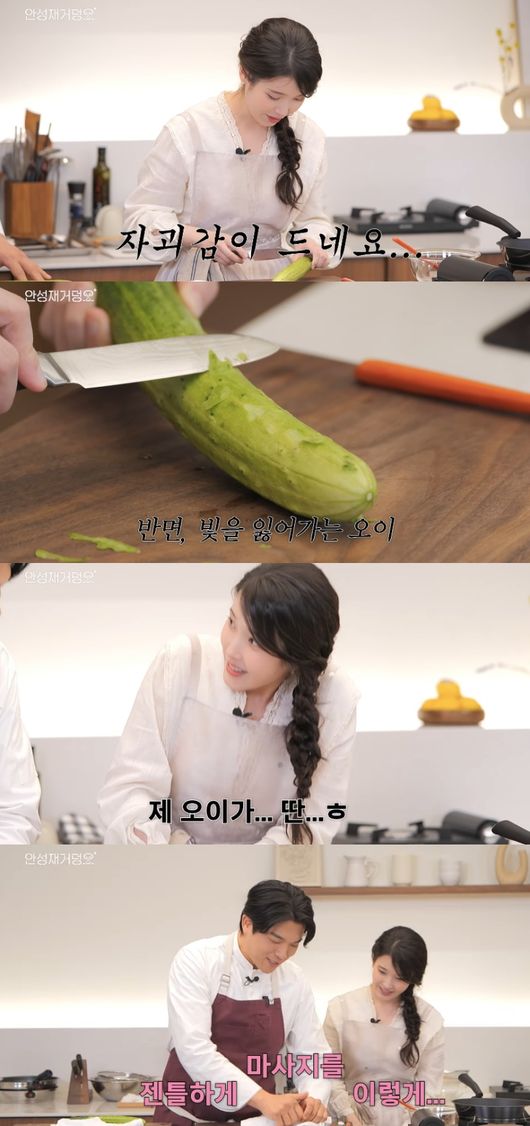 아이유는 “이게 왜 안 되지?”라면서 “제 오이가 좀 단단한 것 같다”라고 했다. 나아가 칼질도 아슬아슬하게 하자 안성재는 올바른 칼질법을 알려주기도 했다.