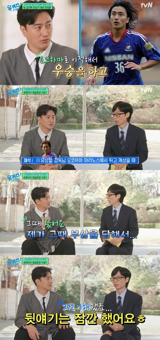 이날 유재석은 일본 요코하마에서 활약했던 안정환의 이야기를 듣던 중 “제가 그 당시에 故 유상철 감독님 요코하마 마리노스에서 뛰고 계셨을 때 제가 호동이 형이랑 촬영하러 갔었다. 그 당시에 요코하마 마리노스에 안정환 선수가 있었다”라고 떠올렸다.