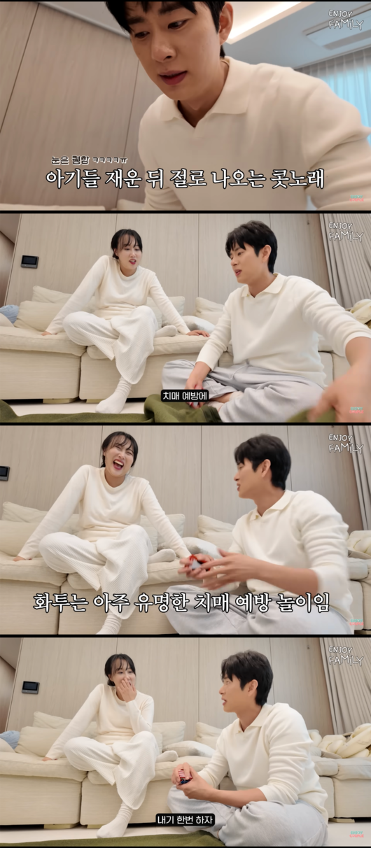 손민수는 육아 퇴근 후 기분 좋게 콧노래를 부르며 거실에 화투를 위한 깔개를 깔며 아내 임라라를 향해 “라라가 맨날 하는 말 있지. 내가 애기를 낳으면서 뇌까지 같이 낳았다. 기억력 깜빡깜빡해가지고. 치매 예방에 이 화투가”라며 능청스럽게 화투 판을 벌인 이유를 설명했다.