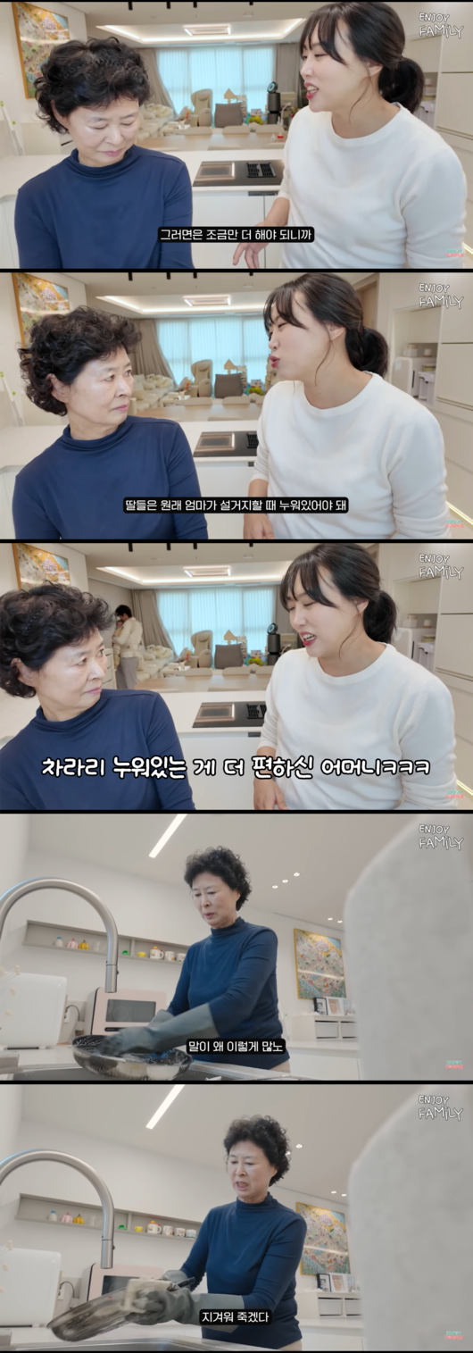 압권은 임라라의 당당한 태도였다. 임라라는 “딸들은 원래 엄마 설거지할 때 누워있어”라며 부엌에서 떠났고, 홀로 남은 시어머니는 “말이 왜 이렇게 많노. 지겨워 죽겠다”라고 혀를 내둘러 폭소를 자아냈다.