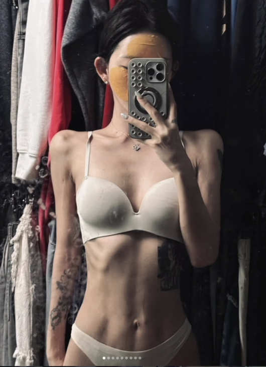 19일 최준희는 거울 셀카 사진을 게재했다. 공개된 사진 속 최준희는 브래지어와 팬티만 입고 거울 앞에 서서 자신의 몸 상태를 체크하고 있는 모습이다.