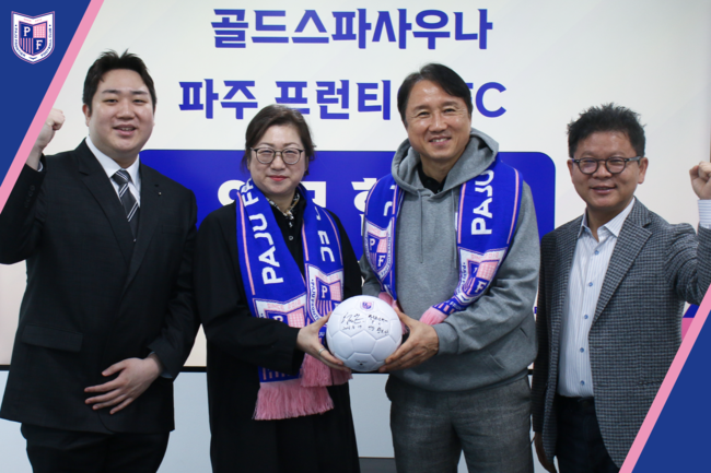 파주는 지난 17일 파주NFC에서 골드스파사우나와 후원 협약을 체결하며 소상공인 협력 프로그램 ‘프런티어 파트너스’에 새로운 축을 더했다. 이날 자리에는 종선자 대표이사와 방상배 대표를 비롯해 황보관 단장 등 구단 관계자들이 참석해 협약의 의미를 공유했다. 단순한 후원 관계를 넘어 지역과 구단이 함께 움직이는 구조를 만들겠다는 의지가 담긴 자리였다.