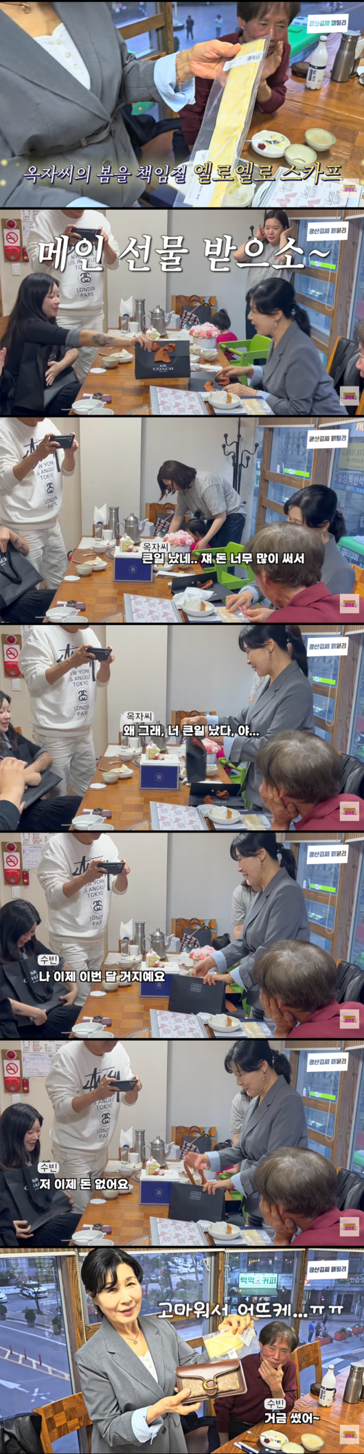 효도의 정점은 식사 자리에서 터졌다. 수빈 양이 할머니를 위해 준비한 회심의 선물인 명품 스카프와 명품 가방을 꺼내 놓은 것. 깜짝 놀란 백 여사가 "큰일 났네. 쟤 돈 너무 썼네”라며 손녀의 얇아진 주머니 사정을 걱정하자, 수빈 양은 “나 이제 이번 달 거지예요. 저 이제 돈 없어요”라는 귀여운 앙탈로 화답해 현장을 폭소케 했다.