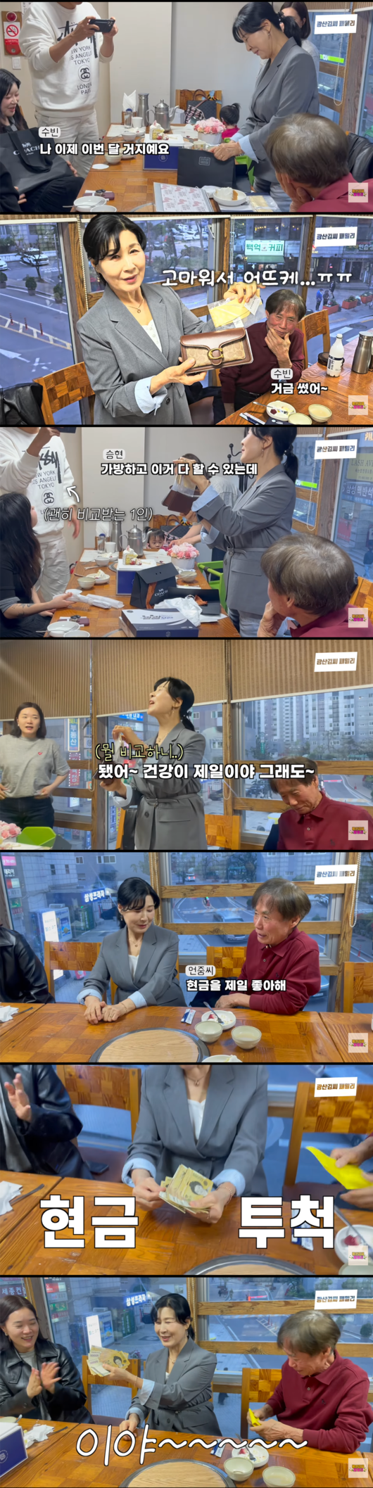 이어 남편 언중 씨는 “옥자 씨가 현금을 제일 좋아해”라는 명언과 함께 현금 뭉치를 터프하게 투척해 가족들의 뜨거운 환호를 이끌어냈다. 손녀의 선물에 감동하던 백옥자 여사는 현금을 받자마자 그 자리에서 즉시 돈을 세어보는 지극히 현실적인 반응을 보여 눈길을 끌었다.