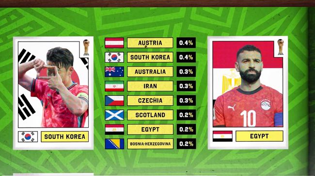 이후 매체가 구체적으로 계산한 표에 따르면 유럽에선 스페인이 15.73%로 1위를 차지했고, 남미에서는 '디펜딩 챔피언' 아르헨티나가 10.45%로 1위에 올랐다. 북중미에선 개최국이자 한국과 함께 A조에 속한 멕시코가 1.58%로 선두를 기록했고, 아프리카에선 모로코가 1.82%로 가장 높았다.
