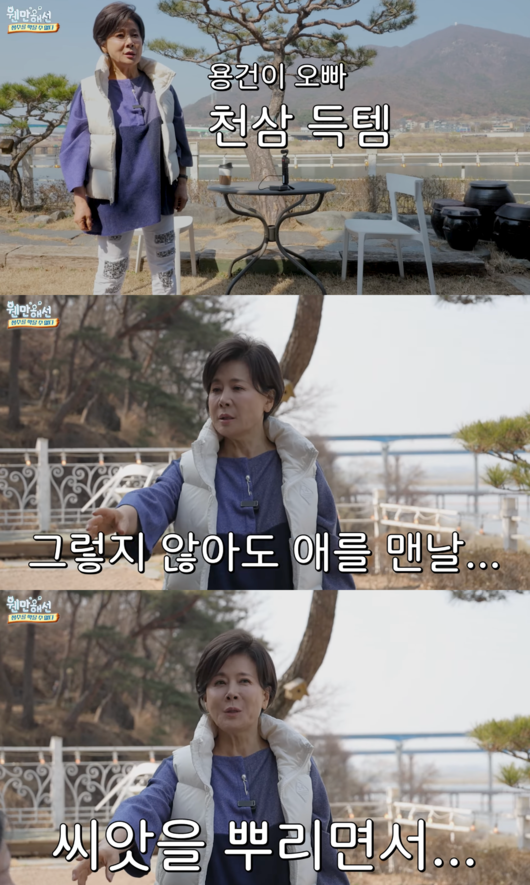 이어 “그리고 용건이 오빠 옛날에 애 낳아가지고 왜 난리났을 때 골프 시합 상품으로 천삼이 나왔다. 근데 용건이 오빠가 그 상품을 탔다. 그래서 용건이 오빠한테 ‘만지지마 그거 먹을 생각 하지 마!’ 그렇지 않아서 맨날 애를 씨앗을 뿌리면서”라고 말해 웃음을 자아냈다. /kangsj@osen.co.kr