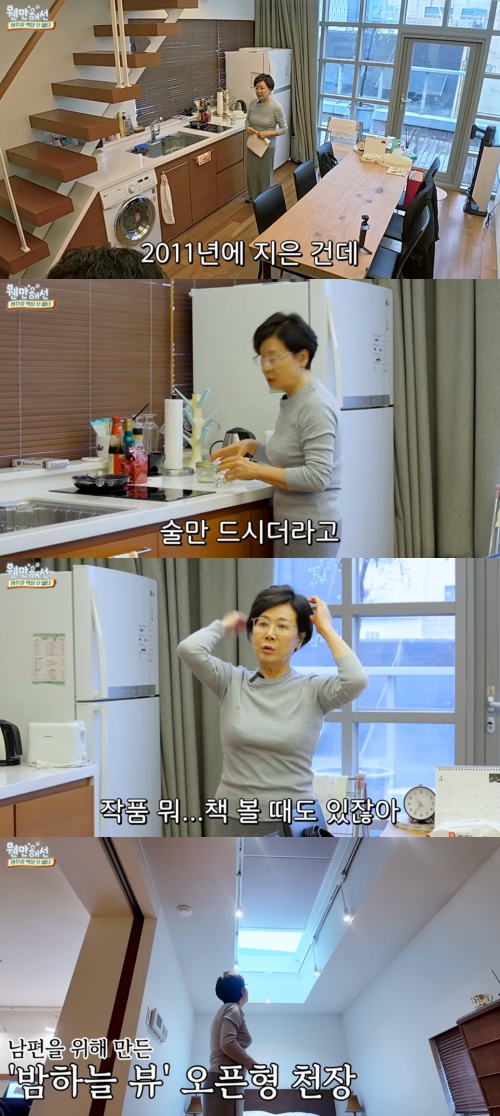 작업실은 복층으로 구성돼 하늘을 볼 수 있는 천창까지 있었다. 이에 대해서도 박정수는 "남편이 누워서 하늘 볼 수 있게 만들어둔 거다. 그런데 여름만 되면 사우나다. 봄, 가을, 겨울에만 좋다"라며 웃었다.