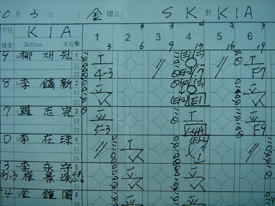 시즌 막판까지 평균자책점(방어율) 타이틀을 놓고 경합을 벌였던 두 올림픽메달리스트 김광현(20. SK)과 윤석민(22. KIA)의 소수점 낮추기 경쟁은 10월 4일 두산 전(광주)에서 7이닝 무실점을 기록한 윤석민의 승리로 결국 끝이 났다. 그간 단 두 명(선동렬, 류현진)에게만 허락되었던 투수부문 트리플 크라운(다승, 방어율, 탈삼진)의 영예를 내심 기대했던 김광현으로선 바로 눈앞에서 사라진 방어율 타이틀이 못내 아쉬울 만하다 하겠다. 윤석민이 종지부를 찍기 하루 전인 지난 3일, 김광현은 당시 1위였던 윤석민(방어율 2.44)이 지켜보는 앞에서 마운드에 올라 7이닝 동안 투구하며 2실점(비 자책점)으로 경기를 마무리, 방어율을 2.39까지 끌어내리며 윤석민을 잠시 2위로 밀어내기도 했지만 운은 거기까지였던 모양이다. 그런데 이날 김광현이 내준 2실점 모두가 비 자책점으로 처리된 것을 놓고 경기 전후에 상당한 논란이 일어났다. 김광현이 KIA전에 등판한다고 했을 때부터 염려스럽던 부분이었는데 결국 우려했던 상황이 벌어지고 만 것이다. 하필이면 윤석민과 경쟁구도에 있는 김광현을 같은 지역구(?)인 광주 마운드에 올린 김성근 감독의 결정이 일면 야속(?)하기도 했지만, 팬들의 관심을 끌기에는 더 없는 최상의 상차림. 이날 논란의 골자는 크게 두 가지였다. 첫 번째는 ‘투수 자신이 잘못한 것이 왜 자책점으로 기록되지 않는가’ 였고, 두 번째는 ‘3루주자의 타이밍을 과연 아웃으로 볼 수 있는가’ 하는 문제였다. 야구에서 자책점은 무척이나 복잡하고도 머리 아픈 존재다. 기록규칙의 양에서도 그렇지만, 안으로 파고 들었을 때의 서로 얽히고 설키는 문제들은 웬만한 조각수의 퍼즐보다도 더 공식기록원들을 난감하게 만들기도 한다. 하지만 아무리 복잡하다 해도 자책점을 이루는 근간이라고 할 수 있는 중심 뼈대는 있기 마련. 이야기를 풀기 전, 자책점을 판단하는 가장 쉬운 기준 몇 가지를 먼저 정리하고 넘어가도록 한다. 1) 실책으로 아웃 되지 않은 타자나 주자의 득점은 무조건 비 자책점이다. 2) 야구는 3아웃으로 이닝이 종료된다. 따라서 3번 아웃 시킬 수 있는 기회 (실제 아웃 + 실책으로 아웃을 면한 경우의 수)이후에 일어나는 득점은 무조건 비 자책점이다. 3) 이닝 중 발생한 실책과 패스트볼을 제외하고 이닝을 재구성한다. 이 정도가 자책점 규칙의 큰 축을 이루는 골격이라고 볼 수 있다. 이러한 전제를 기억하고 김광현이 투구하던 10월 3일 경기로 시간을 되돌려본다. 당시 상황은 기록지(사진)를 참고하도록 하자. KIA의 4회말 공격, 1번타자 유재원이 안타를 치고 출루. 2번 이호신은 투수 앞으로 굴러가는 보내기 번트를 댔다. 그런데 김광현이 서두르다 번트타구를 놓치는 실책(첫 번째 실책)을 범한다. 실책이 없었다면 1사 2루가 되는 상황(이것이 이닝의 재구성 방법이다). 여기서 문제가 되었던 첫 번째 의문점을 풀고 넘어가도록 한다. ‘투수의 실책이 왜 자책점이 되지 않는가’ 하는 문제 말이다. 규칙서부터 들이밀자면 10.18 (e)항에 그 근거를 둔다. ‘자책점을 계산할 경우, 투수의 실책은 다른 야수의 실책과 같이 취급한다’라는 문구다. 이는 미국이나 일본을 포함한 만국공통의 야구규칙이다. 나라마다 달아놓은 나 의 차원이 아니라 골격을 이루는 대전제다. 그러면 그 이유가 뭘까? 자신이 책임져야 할 부분을 다루는데 자신이 잘못한 것에 대해 책임을 지지 않아도 되는 일명 ‘면책특권’을 왜 투수에게 부여하기로 한 것일까? 투수는 타자를 향해 투구할 때에만 투수의 신분이 된다. 투구를 마치고 나면 투수는 더 이상 투수가 아니다. 제5의 내야수로 취급된다. 따라서 투구 다음에 일어나는 투수의 공을 던지는 행위는 모두 투구가 아닌 송구가 된다. 김광현의 경우에는 자신이 직접 실책을 했기 때문에 더욱 그렇게 생각됐겠지만, 만일 김광현이 물러나고 뒤이어 나온 투수가 똑같은 실책을 했다고 가정할 때, 김광현으로선 억울할 수 있다는 생각을 해보면 답을 찾을 수 있다. 이러한 문제 때문에 자책점과 연관된 투수의 실책에 관해서는 책임을 묻지 않는다는 대전제를 깔아놓은 것이다. 다시 기록지로 돌아가자. 3번 나지완의 보내기 번트 성공으로 주자들 진루. 실제 상황은 1사 2, 3루지만 역시 재구성하면 2사 2, 3루가 된다. 여기서 4번타자 이재주가 큼지막한 희생플라이를 친다고 가정했을 때, 3루주자의 득점에는 아무런 문제가 없겠지만, 이닝을 재구성하면 희생플라이 타구는 이닝의 3번째 아웃기회가 되기 때문에 이를 이용한 득점은 비자책점이 되는 상황이었다. 그런데 이재주의 타구는 무심하게도(?) 또다시 김광현에게로 굴러갔고, 김광현은 이 타구를 잡아 3루에서 홈으로 들어오는 주자를 잡기 위해 포수 쪽으로 송구했는데 그만 악송구(두 번째 실책)가 되고 말았다. 이 부분에서 재미있는 상황 한 가지를 떠올려 보겠다. 이재주의 타구를 잡은 김광현이 타이밍이 빡빡한 홈으로 던지지 않고, 아주 여유가 있었던 1루로 던져 타자주자 이재주를 잡았다고 가정해 보는 것이다. 1실점을 각오하고 1루에 던졌더라면 3루주자 유재원의 득점은 영원히 비 자책점이 된다. 왜
