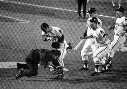 완전한 볼이라는 생각에 공을 흘려보냈다. 상대팀인 긴테쓰 버팔로즈의 포수 쓰지요시키도 크게 벗어난 위치에서 공을 잡았다. 그런데…, 구심인 로자키 모토미가 “스트라이크, 아웃!”을 크게 외쳤다. “어떻게 그 게 스트라이크냐.” 도에이 플라이어즈에서 주전 자리를 꿰찼던 백인천은 로자키 구심을 손으로 쿡 찔렀다. 로자키 구심이 즉각 퇴장을 선언하자 백인천은 그의 목을 감아 넘어뜨렸다. 그 사건이 일어난지 이틀 후 백인천은 고소 당하게 된다.(고소는 곧 취소 됐다) 1970년 5월 23일, 고라쿠엔 구장에서 열렸던 야간경기. 도에이와 긴테쓰는 이상한 분위기에 휩싸여 있었다. 긴테쓰의 선발 투수는 그 전 해 여름철 고시엔대회의 스타였던 오타 고지(미자와고 졸업)였다. 스탠드에 3만 2000명의 관중이 운집한 가운데 1회에 ‘사건’이 일어났다. “그대는 발끈하기 쉬워서 포수보다 외야 쪽이 맞다.” 4년 전, 당시 감독이었던 미즈하라 시게루도 백인천의 그런 성격을 꿰뚫어보고 외야수 전향을 지시했다. 강한 어깨와 파워넘치는 타격도 고려한 조치였다. 최고의 표본도 있었다. 같은 민족의 피가 흐르는 대타자, 장훈이 바로 그였다. 어느 해 시즈오카의 이토 캠프. 백인천이 한밤중 일어나 화장실에 가려는데 넓은 방에서 “붕, 붕”하는 소리가 들린다. 슬그머니 들여다 보니 팬티 하나만 걸친 장훈이 정신을 집중해서 배트를 휘두르고 있었다. 그 장면을 목격한 백인천은 선배에게 뒤지지 않는 ‘연습 벌레’가 될 것을 맹세했고, 피나는 노력 끝에 중견수로 자리를 잡았다. 1969년에는 처음으로 타격10걸(9위)에 들어가, 새로운 비약을 꿈꾸고 있던 참에, 병역 문제가 끓어올랐다. 당시 한국 남성은 20세부터 3년간 병역 의무가 있어, 현재처럼 국제 스포츠 대회에서 좋은 성적을 올린 선수에 대한 병역 면제도 없었다. 백인천의 도에이 구단 입단도 ‘2년 후 병역을 마친다 ’는 조건이 붙어 있었다. 일본에서의 활약으로 입대가 연기돼 있었을 뿐이었다. 한국에서는 병역기피를 노린 국회의원의 아들들의 해외유학이 사회문제로 떠올라 강제 귀국시키려는 움직임이 일었다. 백인천을 일본으로 내보내는 형국이 된 박정희 정권은 ‘특례를 인정해주면 어떤가’라는 비판의 소리도 듣고 있었지만 대통령 선거를 앞두고 부담을 느낀 나머지 백인천을 소환시킬 수밖에 없었다. 결국 백인천은 시즌을 마치고 귀국, 27세의 나이에 육군에 입대했다. 다시 일본 땅을 밟은 것은 이듬해인 1971년 5월1일, 박정희가 대통령 선거에서 3선에 성공한 다음이었다. 그러나 제대를 한 것은 아니었고 남은 병역기간(2년반) 동안 당시 한국중앙정보부(KCIA) 소속의 군인신분이었다. 일본 의회에서는 ‘다른 나라 첩보기관 소속의 사람이 어떻게 공공연하게 플레이를 할 수 있는가’하는 논란이 생겼고, 신문기자들에게도 이 일이 알려져 부담을 느낀 백인천은 그 해 타율 2할3푼8리로 부진했다. 심기일전, 반전을 꾀한 1972년 봄, 기쁜 일이 생겼다. 3월 29일, 고후에서 열렸던 요미우리 자이언츠와의 시범경기에서 백인천은 요미우리의 명투수 호리우치 쓰네오로부터 좌중간 2점홈런을 뽑아냈다. 백인천이 천천히 3루를 돌 즈음 “나이스 홈런”이라는 외침을 들었다. 그 소리의 주인공은 백인천이 동경했던 나가시마 시게오였다. 경기를 마친 후 이동하던 도중 역에서 만나 인사를 했다. 나가시마는 백인천에게 “올해는 3할을 칠 수 있다. 열심히 해라”고 격려했다. 백인천은 하늘에라도 오른 기분이었다. 백인천은 ‘기분파’의 본령을 발휘, 그 해 하늘에도 오르는 생각의 흰색은“기분파”의 본령을 발휘, 그 해에 처음으로 3할대 타율(. 315, 리그 3위)를 기록했다. [번역 및 정리=홍윤표 OSEN 기자] 1970년 5월 23일, 도쿄 고라쿠엔 구장에서 열린 경기 때 스트라이크 판정에 격노, 로기주심을 넘어뜨리는 백인천. 그 오른쪽에 백인천을 말리려고 달려나가는 오오스기(앞)와 장훈(안쪽)의 모습이 보인다. (제공=산케이 신문) 玄界灘を越えて】白仁天物語(3)兵役と退場劇 「軍人」としてプレー 自信を持って見送った球だった。近鉄バファローズの捕手、辻佳紀も大きく外れた位置で捕球している。ところが…。「ストライク、アウト!」。球審の露崎元弥が、得意のオーバーアクションでコールした。「どこを見とるんや」。東映フライヤーズでレギュラーをつかんでいた白仁天は露崎を手で突き、退場を宣告されると首投げまで見舞った。2日後、白は告訴されることになる(まもなく取り下げられた)。 昭和45年5月23日。後楽園球場のナイター、東映対近鉄は異様な雰囲気に包まれていた。近鉄の先発は、前年夏の甲子園のアイドル太田幸司(三沢高出)。スタンドに3万2000人のファンが詰めかける中、一回に“事件”は起きた。 実は試合前、気になる報道もあった。「韓国国防部が、白に徴兵検査を受けるよう召還命令を出した」との時事電。白は「兵役は韓国国民の義務。服従する」とコメントしたが、内心穏やかではなかった。召還通知が届けば、これが日本での最後の試合となるかもしれなかった。 「お前はカッとしやすい