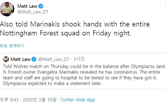 맷로 기자는 "노팅엄 포레스트-밀월전 당시 마리나키스 구단주는 선수를 포함한 팀 전체와 악수를 나눈 것으로 알려졌다"라고 전했다.