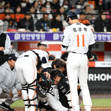 2026.03.31 20: 32헤드샷에 쓰러진 허경민 걱정스럽게 바라보는 엄상백
