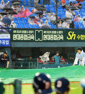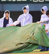 2013.06.11 19: 11우천으로 잠시 중단, 잠실구장에 방수포가 깔리며