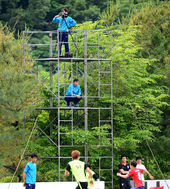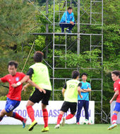 철골 구조물에 올라 경기 지켜보는 이광종 감독