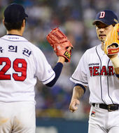 2013.07.06 20: 10유희관-오재원,'승리를 향한 하이파이브'