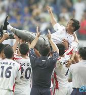 2005.07.31 21: 50첫 경기서 이기고 감독을 헹가래치는 북한선수들