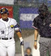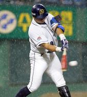 빗속에서 타격하는 김동주