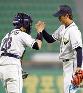 2005.08.30 22: 26손을 굳게 맞잡는 용덕한과 정재훈