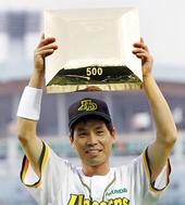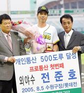 2005.09.08 18: 41사상 첫 통산 500도루 기념패를 들고 기뻐하는 전준호