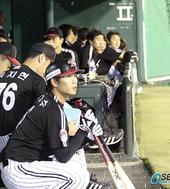 2005.09.24 19: 55비로 경기가 중단돼 무료한 현대 덕아웃
