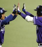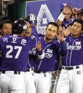2005.10.05 18: 43선제 2점 홈런을 치고 동료들의 환영을 받는 이호준