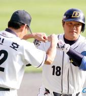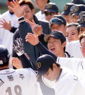 2005.10.08 16: 04홈런을 치고 동료들의 환영을 받는 김동주