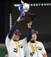 2005.10.19 22: 53준우승 트로피를 들어보이는 홍성흔과 최경환