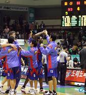 2005.11.26 17: 214연승을 거두고 좋아하는 선두 모비스 선수들
