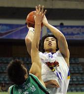 김주성 위로 솟구쳐 점프슛을 날리는 방성윤