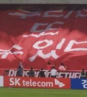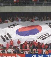 대형 태극기를 펼쳐 보이는 붉은 악마