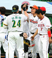 2007.07.17 18: 45홈런 레이스서 우승한 뒤 축하를 받는 김태균