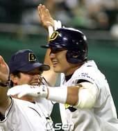 2007.08.26 18: 08동점 홈런을 치고 동료들의 환영을 받는 홍성흔