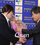 고양시장의 꽃다발을 받는 장미란