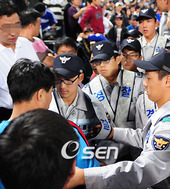 2008.10.08 21: 05삼성응원석에서 롯데 야구팬을 제지하는 경찰들