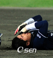 2008.10.27 19: 06도루를 하다 송구된 볼에 맞아 괴로워 하는 오재원