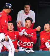 2009.04.29 19: 23선제 타점과 득점을 올리고 동료들의 환영을 받는 박경완