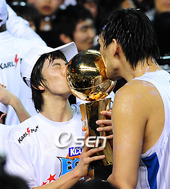 우승 트로피에 키스하는 하승진과 강병현