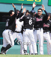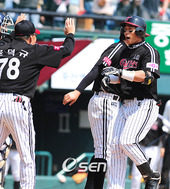 2009.05.05 14: 413점 홈런을 치고 동료들의 환영을 받는 박경수