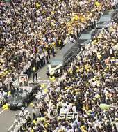 운구차량을 따르는 애도의 노란 물결