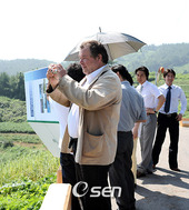 알솝 일행에게 경도 개발 조감도를 놓고 설명하는 여수시 투자유치 담당자