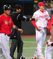 서재응의 투구에 맞고 항의하는 정근우