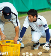 2010.08.03 17: 07김현수,'코치님과 함께 공 정리'