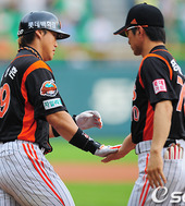 2010.08.05 17: 16이원석-황재균,'하이파이브를 하며'