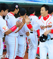 2010.09.12 17: 23김재현,'동료들과 200홈런의 기쁨을 나누며'
