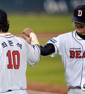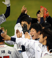 2010.10.05 18: 37환호하는 최준석,'라인드라이브로 바로 잡았어'