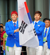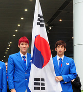 2010.11.09 14: 36'기수' 박태환-이용대, '태극기 들고 광저우 입성'
