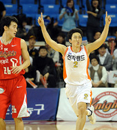 2010.12.08 20: 41환호하는 정영삼,'3점슛 승리가 보여'