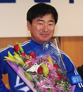 2011.01.05 12: 12꽃다발을 들고 환하게 웃는 류중일 감독