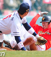 2011.03.19 13: 29박재홍,'송구된 볼이 머리에 직격!'