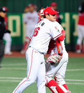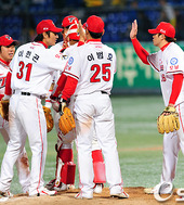 2011.04.14 22: 08승리의 기쁨 나누는 서재응-김상훈