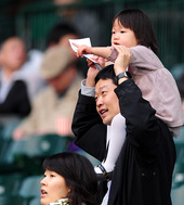 경기장을 찾은 박찬호 부인과 딸,'아빠 저기 있어!'